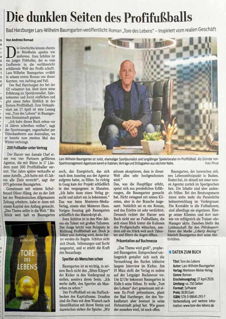„Tore des Lebens“ ist ein packender Fußballroman, der hinter die Kulissen des Profisports blickt – dorthin, wo Verträge, Schlagzeilen und Erwartungen Menschen formen, brechen und manchmal wieder zusammensetzen. Lars-Wilhelm Baumgarten erzählt emotional, direkt und ohne Schönfärberei von einer Karriere, die alles verspricht – und alles kosten kann.
